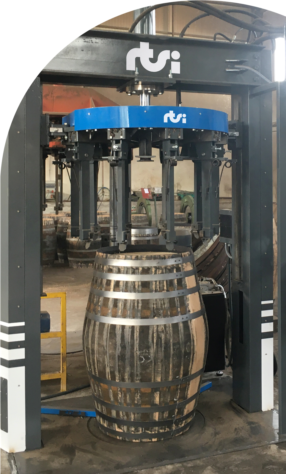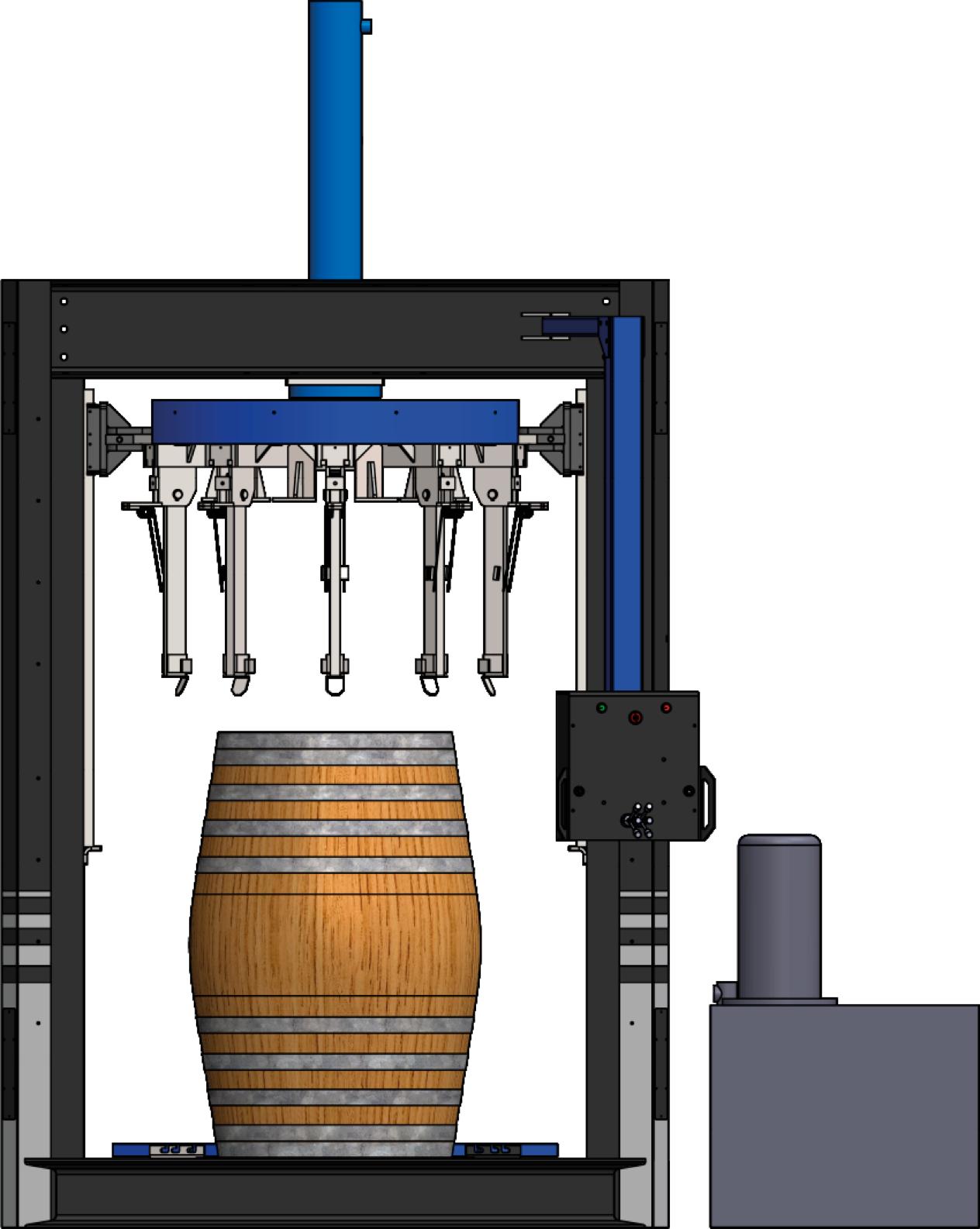 Máquina hidráulica que facilita la finalización del proceso de fabricación de barricas de vino. Prensa y coloca los aros, desde el bojo hasta el talugo de coronar, en su posición y alineación correcta.