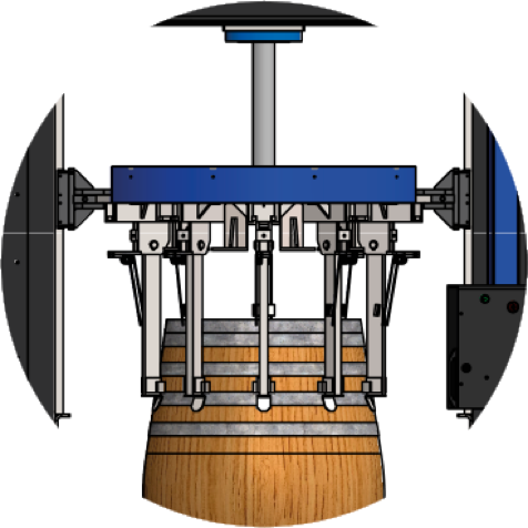 Con 10 brazos de movimiento sincronizado y adaptables a los diferentes diámetros de los aros, dotados de uñas de acero especialmente mecanizadas y tratadas para facilitar la tarea sin dañar la madera.